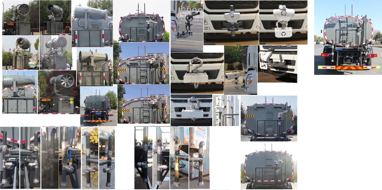 該車主要用于城鄉園林綠化噴灑;主要裝置為罐體及噴霧裝置;罐體總容量:11.61立方米,罐體有效容積:11.05立方米,罐體外形尺寸(長×長軸×短軸)(mm):5000×2350×1600,5000×2350×1520;ABS型號/生產廠家:3631010-C2000/東科克諾爾商用車制動系統(十堰)有限公司,ABS 8/東科克諾爾商用車制動系統(十堰)有限公司,4460046450/威伯科汽車控制系統(中國)有限公司,J ABS/焦作博瑞克控制技術有限公司;側、后防護材料均為:Q235碳鋼,連接方式均為:螺栓連接,后部防護截面尺寸(mm):120×50,后部防護離地高度(mm):480.隨底盤選裝駕駛室,選裝油箱安裝位置;選裝噴霧裝置樣式.采用4700mm,4500mm軸距.選裝限速裝置,限速89.選裝弧形噴霧裝置,選裝箭頭燈裝置,選裝水炮支架位置,選裝高位花灑管道樣式,選裝前部自動炮樣式,前伸500mm,整車長度為9150,9000(mm)。