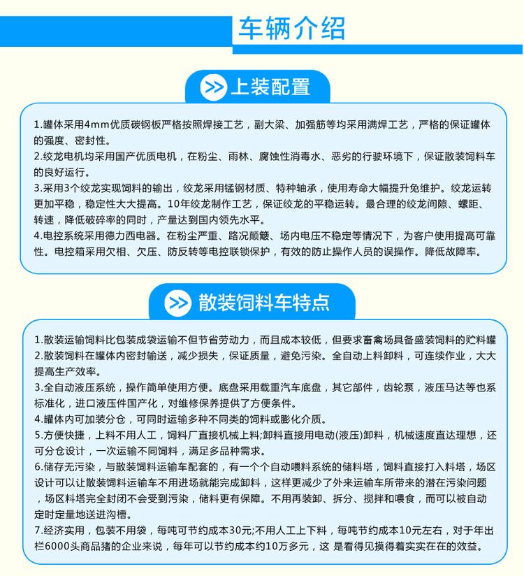 散裝飼料車,又稱散裝飼料運輸車,飼料運輸車。結(jié)構(gòu)簡單、性能可靠、輸送量大、操控方便、機(jī)動性強(qiáng)、對物料 等特點,廣泛應(yīng)用于各大中小型養(yǎng)殖企業(yè)的飼料的運輸。