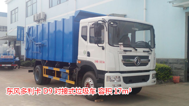 多利卡D9底盤改裝對接式垃圾車,有效容積17方,對接式全密封箱體結構,雙尾液壓開閉,尾部帶3厘米橡膠密封壓條,箱體雙液壓缸舉升自卸,箱體鋼筋加固!