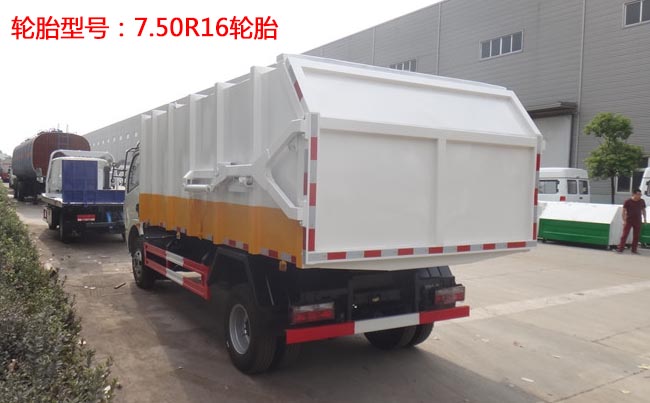 容積7~8立方米,方形密封式箱體,材質邊三底四,國產油泵、多路閥、取力器、液壓油缸,駕駛室外部操作,箱體底部雙杠液壓舉升卸料,箱體后門液壓開啟。