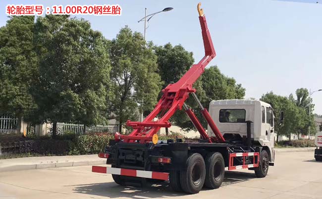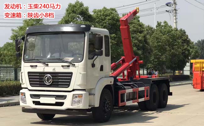 東風后雙橋勾臂式垃圾車,齊星駕駛室,玉柴240馬力發動機,陜齒小8檔變速箱,軸距4350+1300輪胎,前橋5噸,后雙10噸,11.00R20鋼絲胎,帶ABS,下防護。