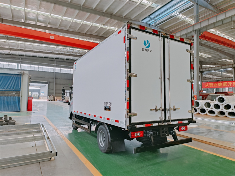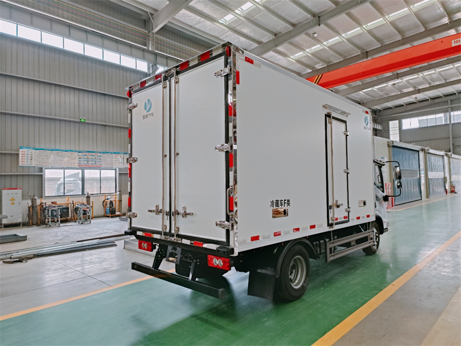 廂體采用內(nèi)外玻璃鋼材料制作,中間夾層為高密度保溫材料,用真空復合一次成型,表面光潔平整,強度高,使用壽命長,廂體邊緣采用優(yōu)質(zhì)鋁合金包邊和專用密封膠處理,具有重量輕、保溫、密封效果好等特點。門框鎖件為不銹鋼材質(zhì),門四周用一次成型密封條密封,廂體外形平整美觀,車廂頂部加以雨檐,避免下雨天雨水對車廂的浸泡,延長廂體使用壽命,車廂內(nèi)配有人性化照明系統(tǒng)。穩(wěn)固性和氣密性是普通冷藏車廂體不可比的,并且具有質(zhì)量輕,抗沖擊力強,無滲透等優(yōu)點。配備國產(chǎn)580制冷機組。