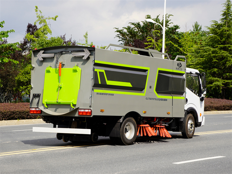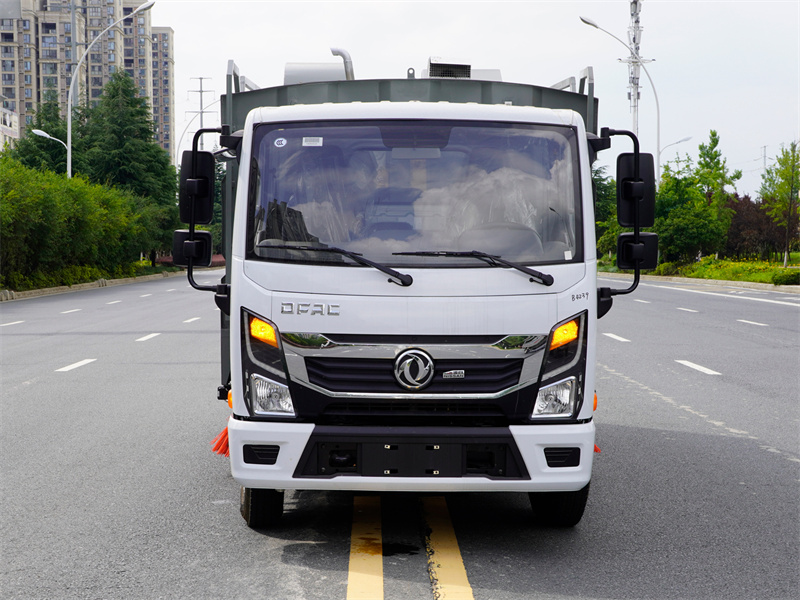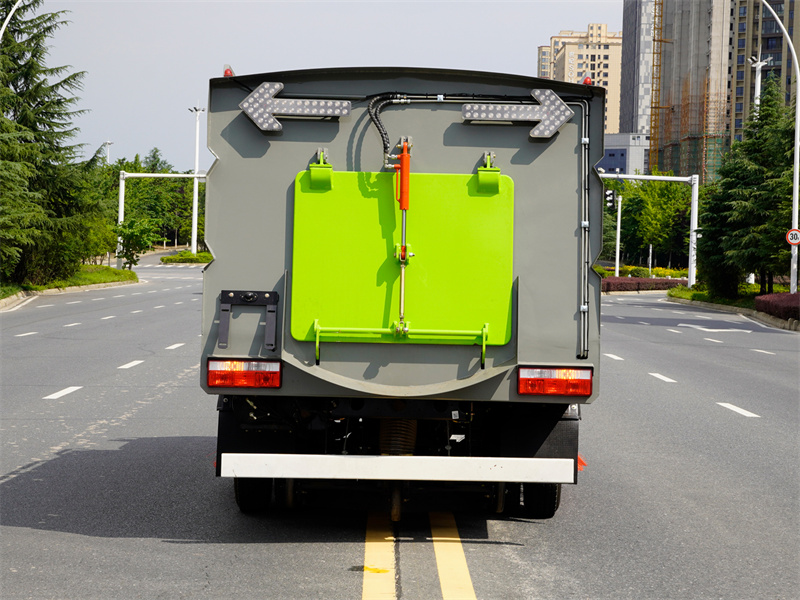 上裝標配:帶4個掃盤、江鈴87馬力副發動機、三洋馬達、施耐德控制開關、海普瑞斯電磁閥組、無級變速自動離合器、免維護離心式自動風機、尾部LED箭頭指示燈、手動泵應急系統、上海新西山電子水泵,垃圾舉升自卸功能
