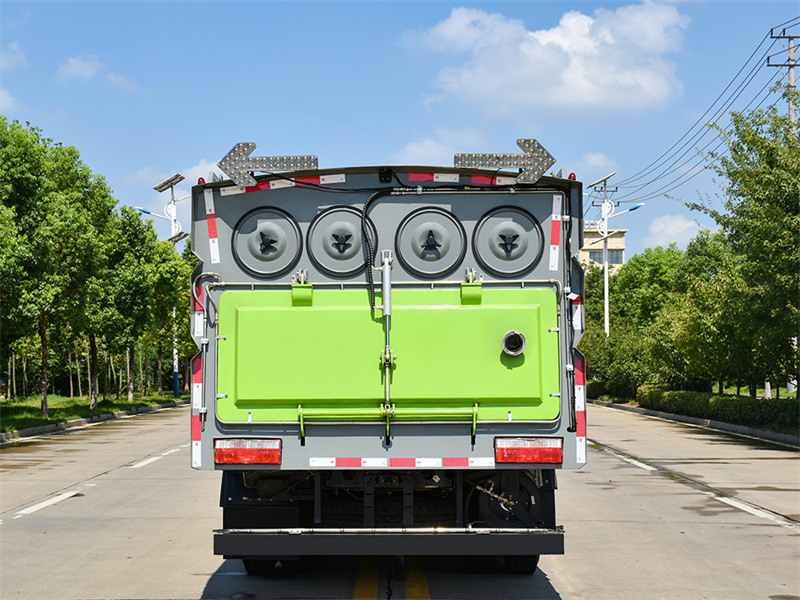 8. 尾部加有噴桿,通過電磁隔膜泵驅(qū)動噴水路面抑塵。箱體上裝:優(yōu)質(zhì)碳銹鋼垃圾箱,3mm 邊板,4mm 底板,用于儲存垃圾,底板整體 折邊無縫焊接,杜絕了泄漏風(fēng)險。簡潔美觀、抗變形性能強、結(jié)構(gòu)可靠性好,同時有 效增加實際裝填容積,超過同類產(chǎn)品,不易變形、耐磨損、耐腐蝕性強。 自卸:液壓缸舉升,垃圾箱自卸。 副發(fā)動機:副發(fā)動機為風(fēng)機運轉(zhuǎn)提供動力。風(fēng)機:副發(fā)動機和風(fēng)機是清掃車的兩大核心部件、副發(fā)動機為風(fēng)機運轉(zhuǎn)提供動力、使 得路面垃圾被吸入箱體內(nèi)部存放,從而實現(xiàn)路面清潔作業(yè)。風(fēng)機采用大功率耐磨離心 式免維護風(fēng)機,無噪音,效率高風(fēng)量大,使用壽命長。 自動離合器:減少風(fēng)機啟動和停止時對發(fā)動機的沖擊。離合器在使用過程中具有高度 耐磨、使用壽命長、低噪音、低油耗量和節(jié)省成本的優(yōu)點。 吸盤:吸盤內(nèi)置滾掃,有效清掃路面垃圾。 濾芯:豎直濾筒,方便清理、拆卸。 電磁閥:海普瑞斯電磁閥組是車輛液壓系統(tǒng)的核心部件,控制整車液壓驅(qū)動,雙向操 作按鈕,包括掃盤升降、吸盤升降、垃圾箱舉升、后門開閉等一系列機械操作,隨車 配備的有電磁閥控制盒罩,有效避免灰塵及垃圾物進入盒內(nèi)。 側(cè)邊刷:增加作業(yè)寬度,并有效將垃圾掃入吸盤位置。 影像系統(tǒng):車體后方裝有監(jiān)視探頭,實時監(jiān)控作業(yè)情況并顯示在駕駛室內(nèi)顯示屏上, 最大限度的保證清吸效果。控制開關(guān):集成疊加設(shè)計,PLC 駕駛室電液集中控制,方便操作。 電子隔膜泵:控制尾部噴水桿,噴水抑塵。 應(yīng)急系統(tǒng):可通過手動應(yīng)急液壓泵來控制全車液壓系統(tǒng)。 尾部噴水:作業(yè)完成后,尾部抑塵。