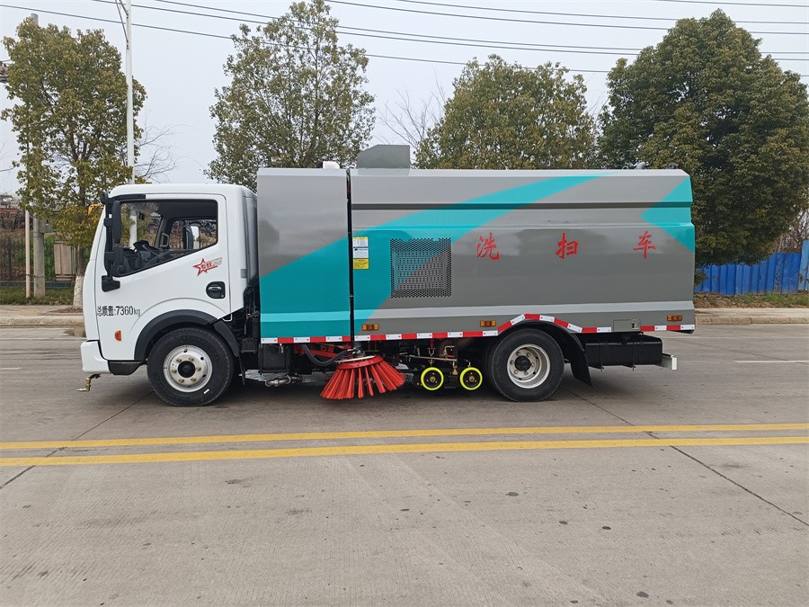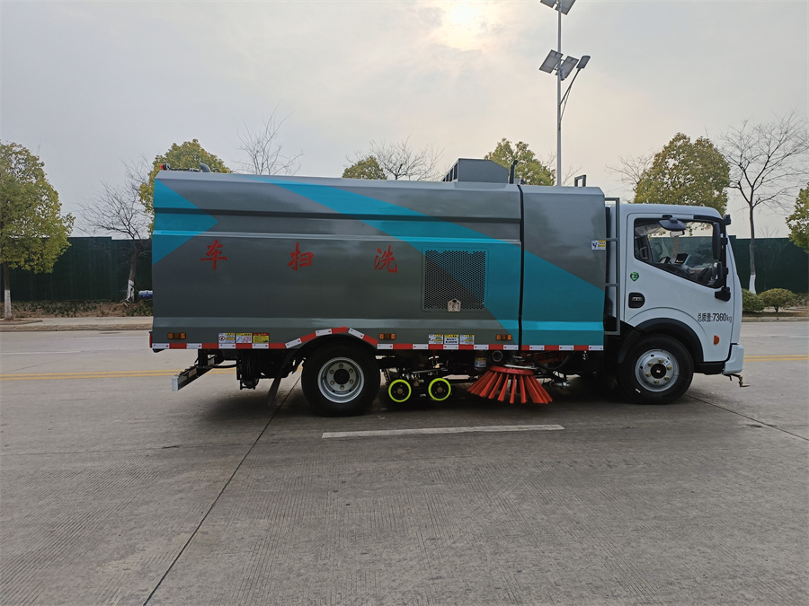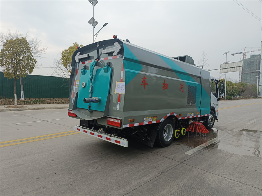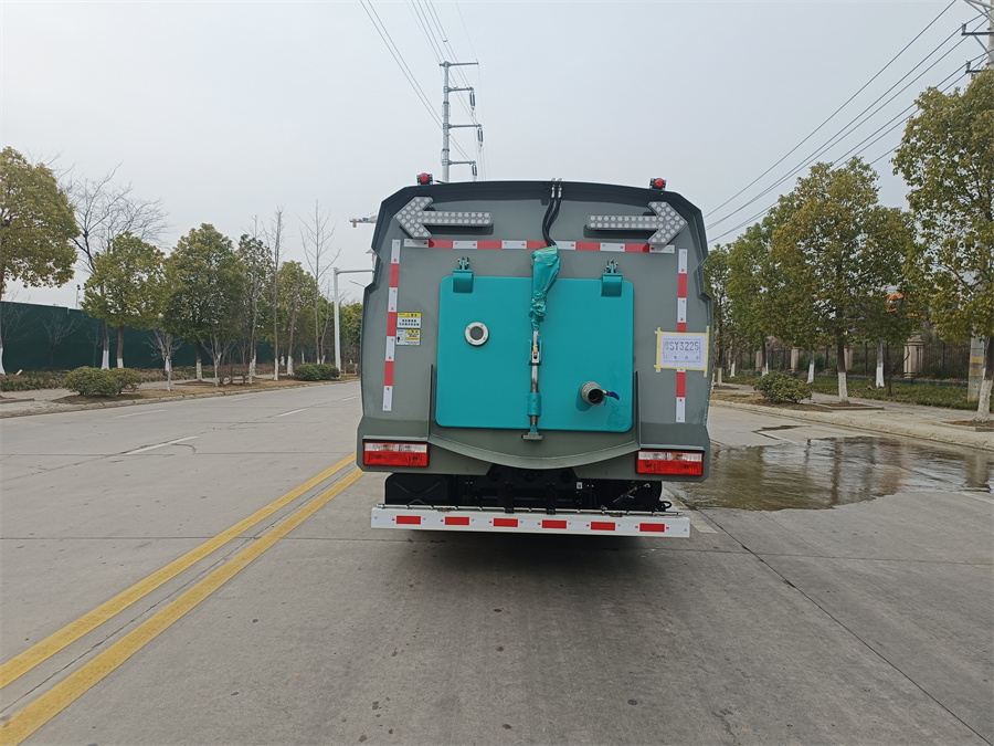 箱體材質為Q235碳鋼,箱體做電泳處理。可選不銹鋼水箱,垃圾箱水箱,容積3方,塵箱容積3方。帶2個中置掃 盤,玉柴102馬力副發動機;三洋馬達;高壓水泵(前沖/側噴/中噴/沖洗水槍/垃圾箱 自潔裝置);控制器;控制箱;PLC一鍵控制;尾部LED箭頭燈;垃圾箱、水箱均帶防 溢低水位報警裝置;倒車及洗掃狀態室內監視器。20m高壓沖洗卷盤。,洗掃車帶灑水功能,可以沖洗路面