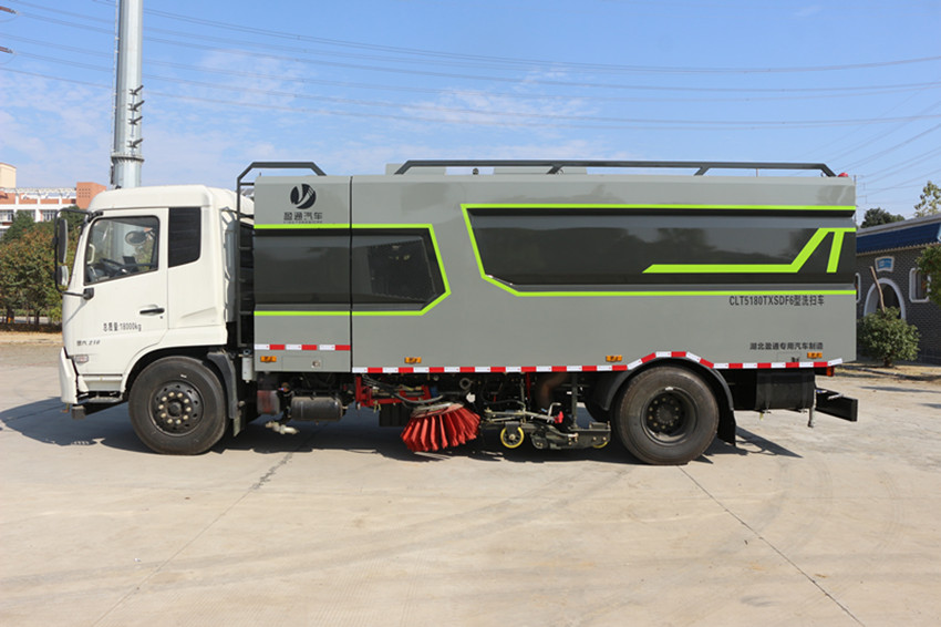 1.CLT5180TXSD6型洗掃車適用于城市道路、高速公路、廣場、機場、碼頭、遂道、橋梁、隔離墻避、路緣和路緣石立面的機械化清洗、清掃、噴霧降塵等清潔作業(yè)。具有路面清洗、路面清掃、路緣清洗、路緣和路緣石立面洗刷、低壓沖洗、噴霧除塵等多功能。有“全洗掃”、 “右洗掃”、 “全掃”、 “右掃”4種作業(yè)模式可選擇。選擇“全洗掃”模式清洗廣場和路面,清洗效率高效果好,洗凈率達90%以上。選擇“左洗掃”或“右洗掃”模式清洗路面和路緣、洗刷路緣石立面。需要進行路面清掃或路面保潔作業(yè)時,可選擇掃路模式。需要噴霧除塵時,可開啟噴霧裝置,進行噴霧除塵作業(yè)。可以像灑水車一樣對路面進行低壓沖洗作業(yè)。