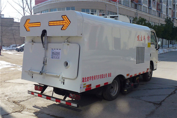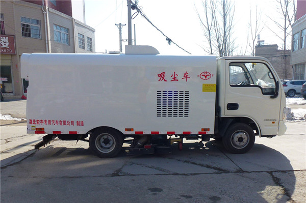 該吸塵車是采用躍進型國五二類原廠汽車底盤改裝,加裝副發動機、風機、清水箱、垃圾箱、中置吸盤,工作視頻探頭,自動脈沖清理功能,液壓系統、專用裝置電控系統和副車架等改裝而成。