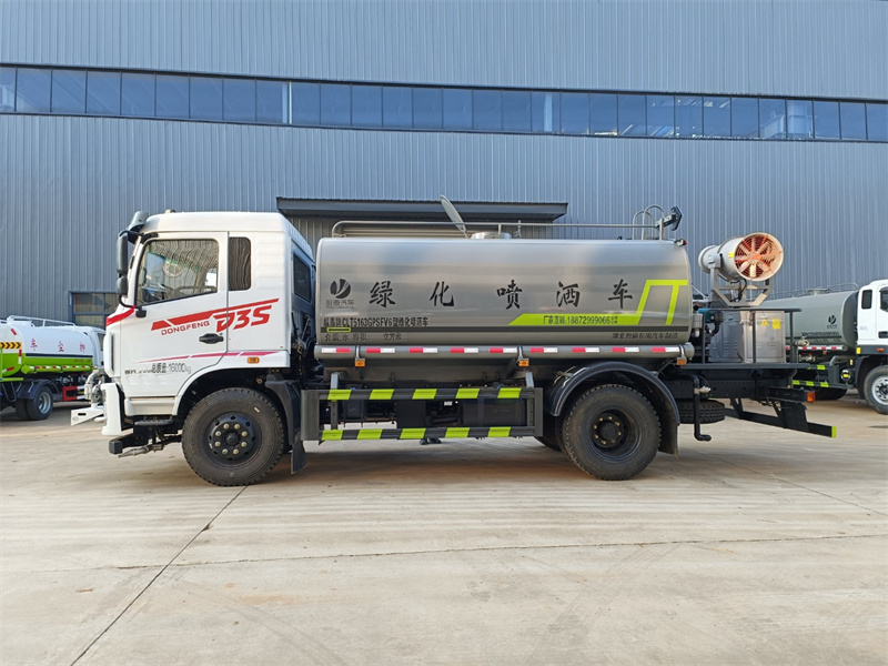 東風12噸霧炮灑水車產品標配前噴(鴨嘴)、后沖、后灑、側噴、后置式工作 平臺,平臺上配置綠化水炮(可 360°旋轉,既可以調成柱狀,也可 以調成霧狀,更可以調成直沖狀、大雨、中雨、小雨、毛毛雨),配 備優質大功率專用灑水泵(可自吸自排,可從河里或池塘抽水到罐體), 取力器,雜物過濾網,消防接口,自流球閥系統、取力器、球閥、濾網 均為國家標準產品,主管道加粗,法蘭墊、法蘭盤加厚,大通徑球閥。 整體具備性能優良安全可靠、效率高、流量大、維修方便等特點